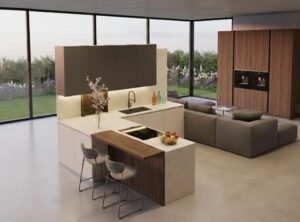 Cucina ad isola e cucina con penisola hanno il grande vantaggio di offrire spazio di lavoro da più lati: la scelta in questo caso viene fatta tra l’aumentare più possibile la capacità della cucina e riempire con basi tutti i lati, oppure lasciare spazi aperti e inserire uno snack in abbinamento ad alcuni sgabelli, molto utili per seguire i bambini durante i compiti o per un conviviale apertivo con gli amici