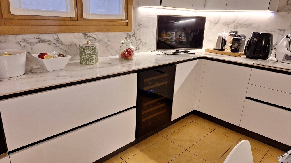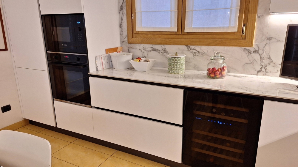 Questa cucina moderna su misura nasce da un progetto attento ai dettagli (lo scoprite a colpo d'occhio osservando come lo schienale incornicia la finestra) pensato per valorizzare questo ambiente al meglio, rendendolo elegante e chic. L’obiettivo è chiaro: ottenere una cucina contemporanea, capace di dialogare con l’architettura pre-esistente senza rinunciare alla praticità quotidiana.