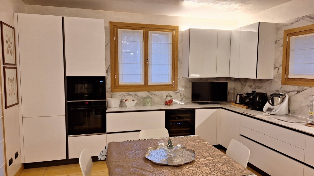 cucina moderna, cucina bianca, cucina vetro lucido, cucina bianco opaco, cucina angolare, cucina con elettrodomestici, progettazione arredo Padova