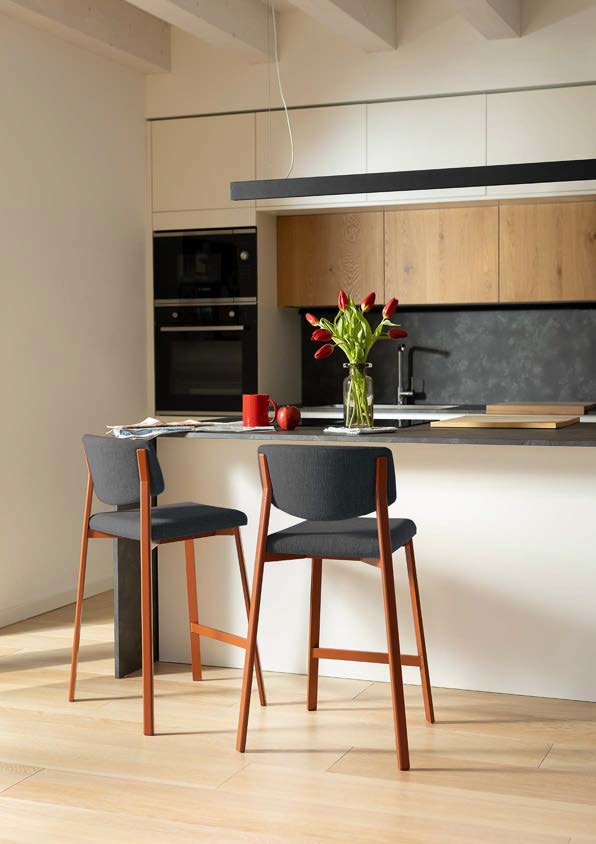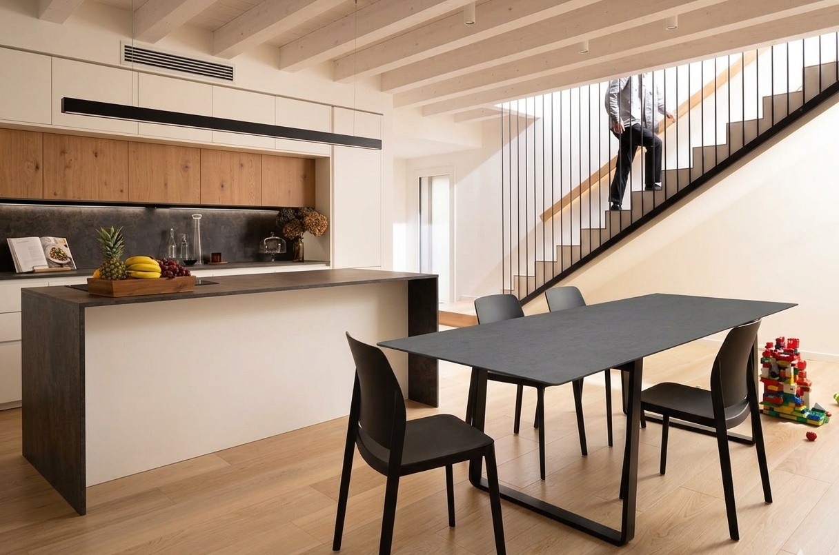 La zona pranzo adiacente alla cucina crea un flusso naturale tra i due spazi. Il tavolo da pranzo con lo stesso top in HPL della cucina unisce visivamente le due aree, mentre le sedie moderne e confortevoli invitano a trascorrere momenti piacevoli in compagnia.