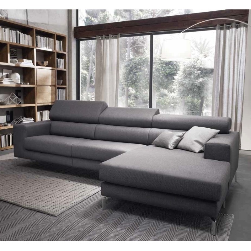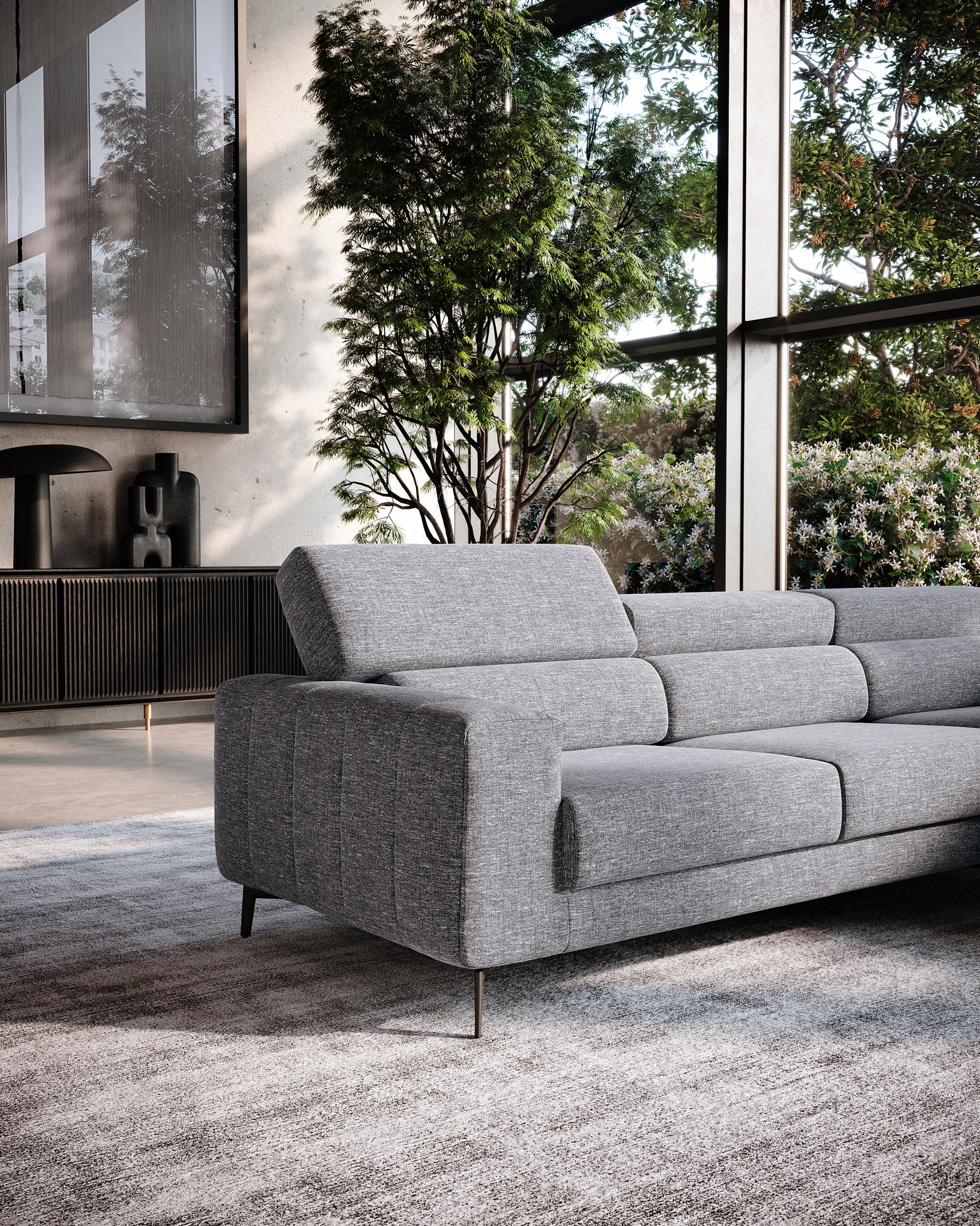 Divano attualmente esposto nella versione 3 posti con penisola chaise loungue in tessuto con sedute movibili e poggiatesta reclinabile: la profondità aumenta fino a 40 cmq in più e ci si può rilassare. Se invece vi piace la forma ma non volete meccanismi, questo divano può essere realizzato anche nella versione fissa.