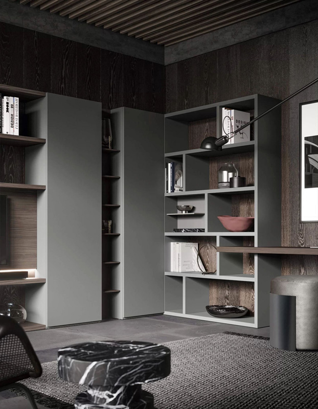 Libreria ad angolo con scrivania SLH integrata, realizzata con sistema a spalla abbinato ad un piano uso scrivania. Mobile realizzabile in tutte le finiture di laccato, materico effetto legno o vero legno