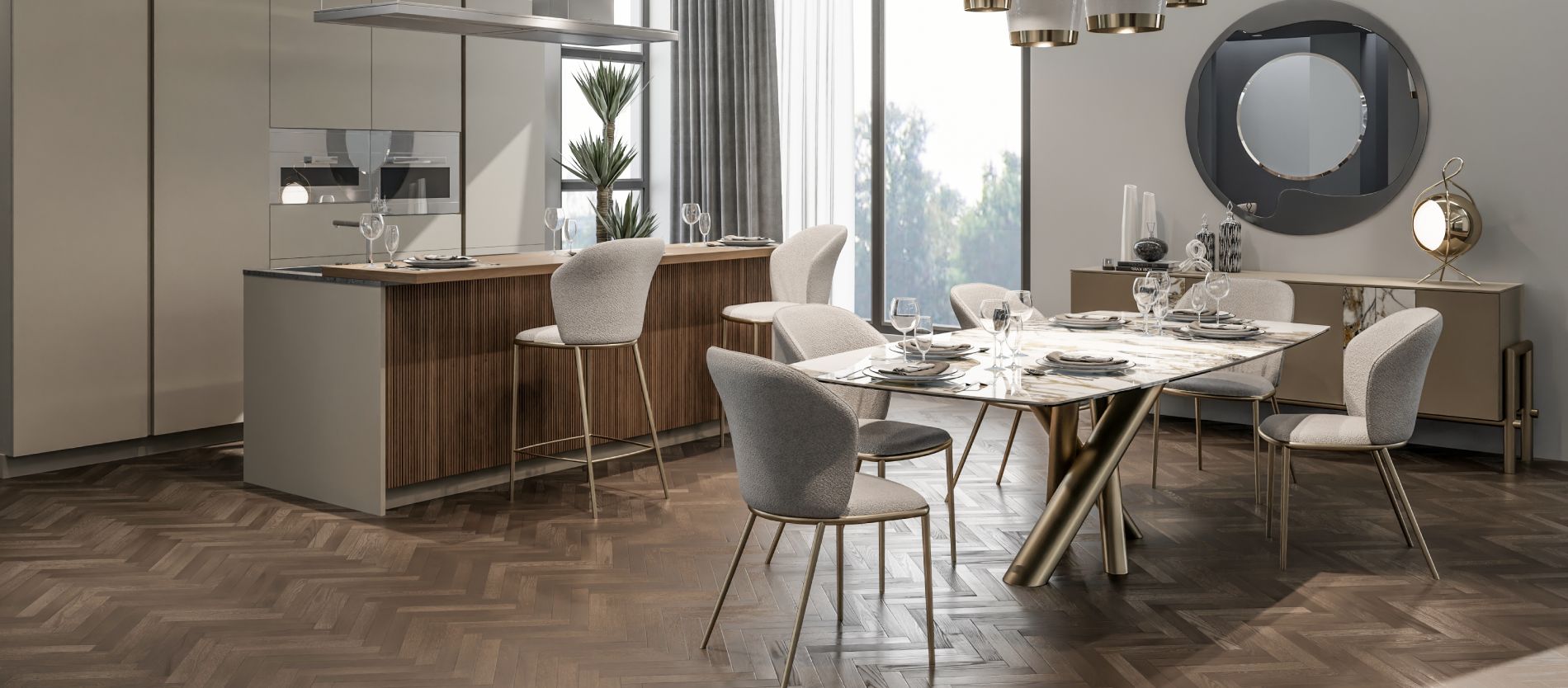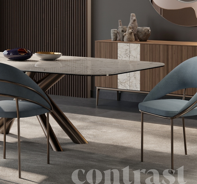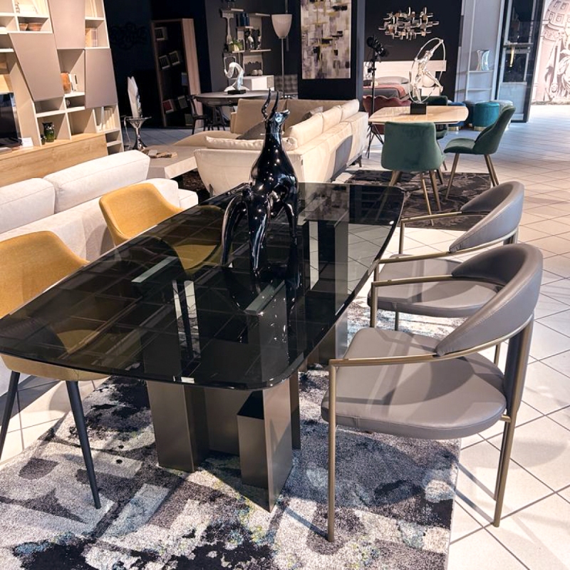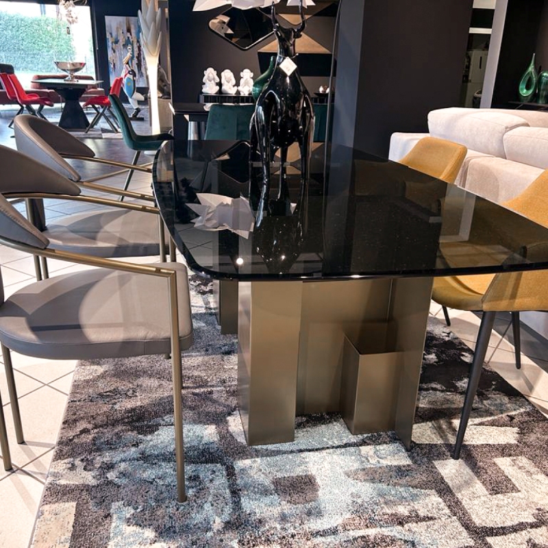 La collezione di tavoli Tentazioni si contraddistingue oltre che per i piani in ceramica e vetro, anche per le sue particolarissime gambe in metallo verniciato bronzo, champagne, nero e titanio come le gole delle nostre cucine.