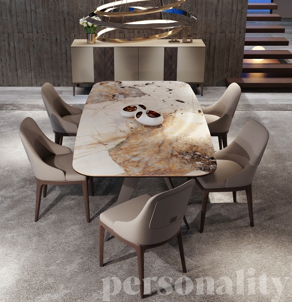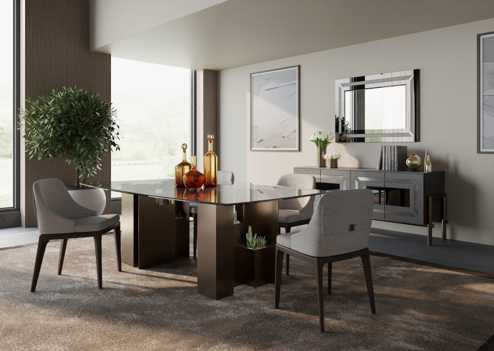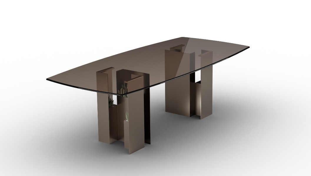 Il piano dei tavoli è disponibile i vetro fumè o bronzo nelle finiture trasparente, sabbiato o specchiato; in ceramica lucida o opaca nelle finiture più ricercate come il sahara noir, il calacatta gold, blanc de blanc o lo statuario.