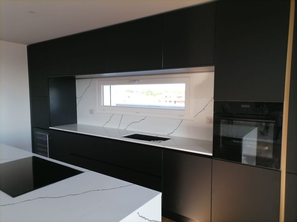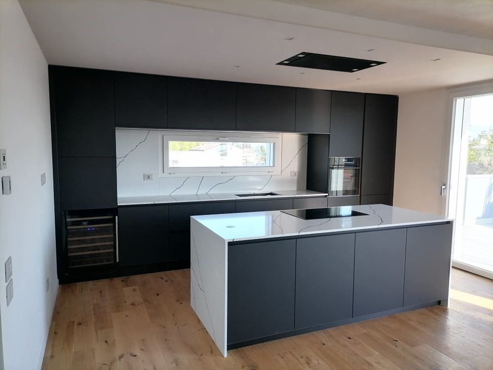 Il design della cucina gioca su un contrasto elegante e contemporaneo (con l’aggiunta di un dettaglio sofisticato e particolare richiesto espressamente dal cliente….scorri per scoprire quale!)