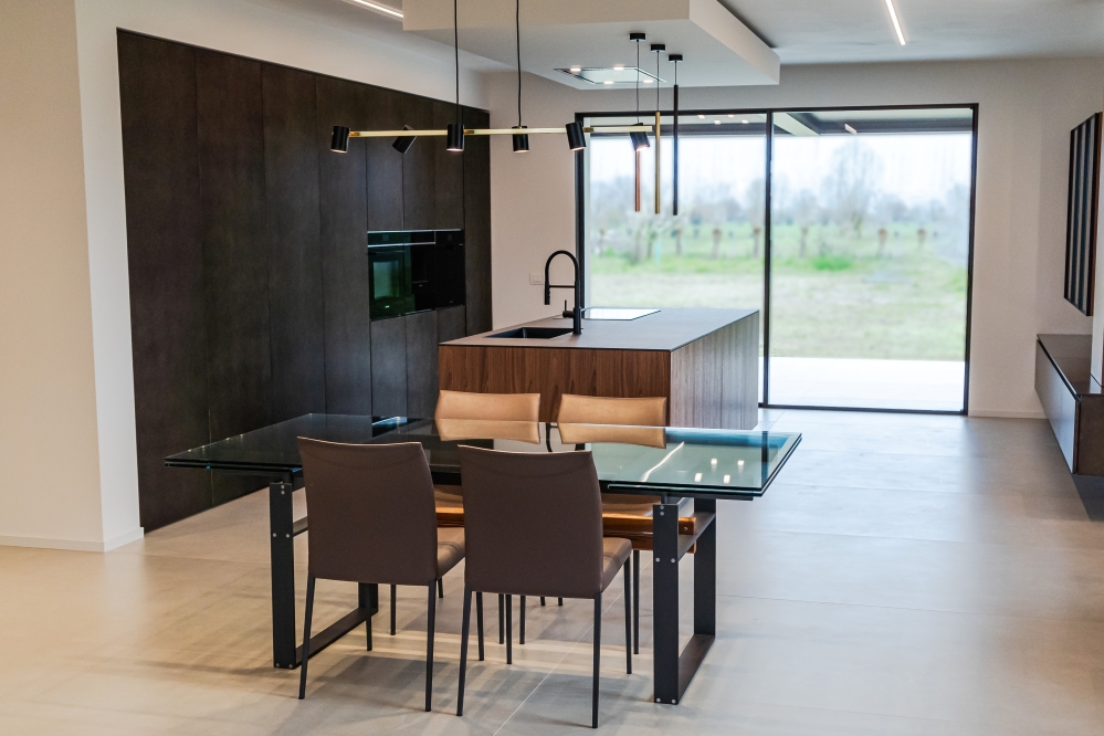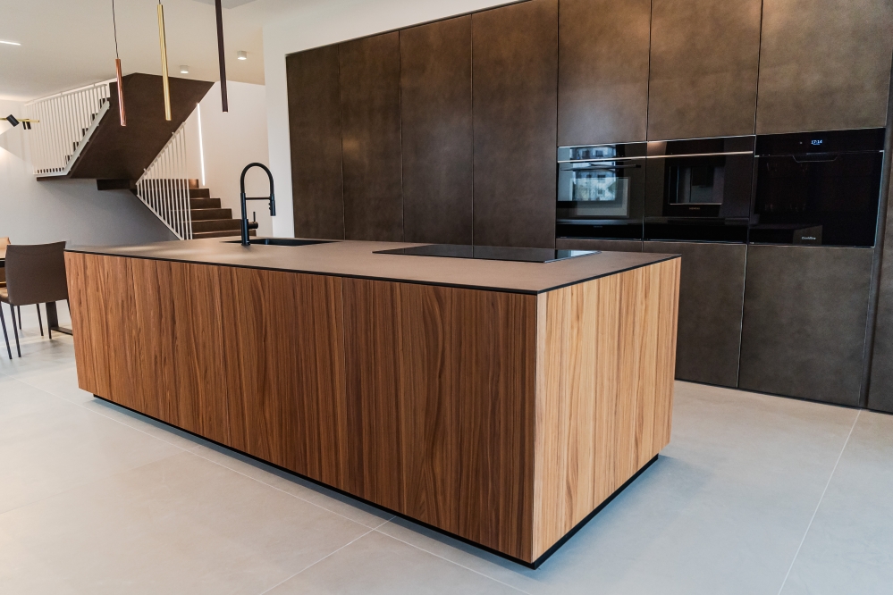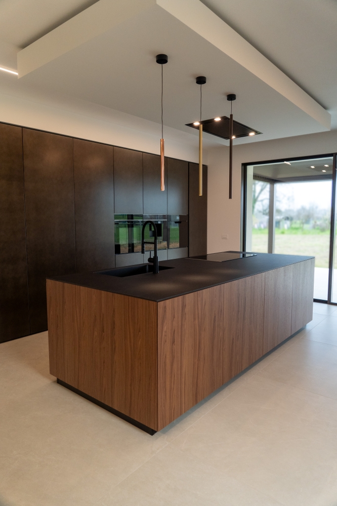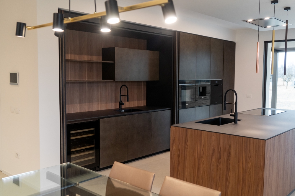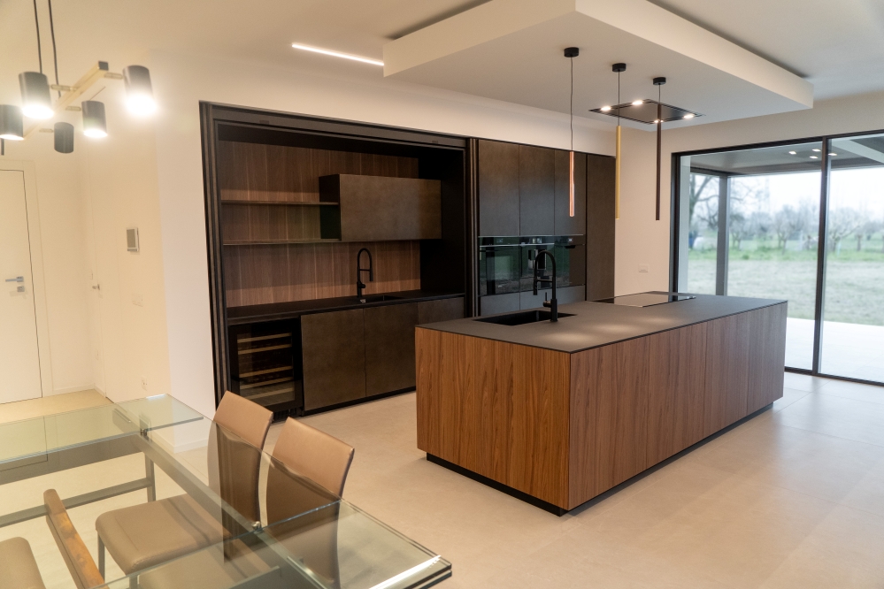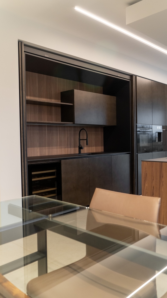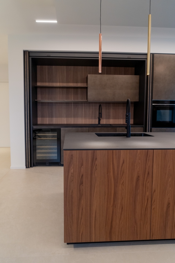 La parete colonne, realizzata in laccato metallizzato bronzo, domina la scena con il suo aspetto estremamente elegante e contemporaneo. A contrapporsi, il noce canaletto impiallacciato dell’isola e dell’interno della cucina a scomparsa.