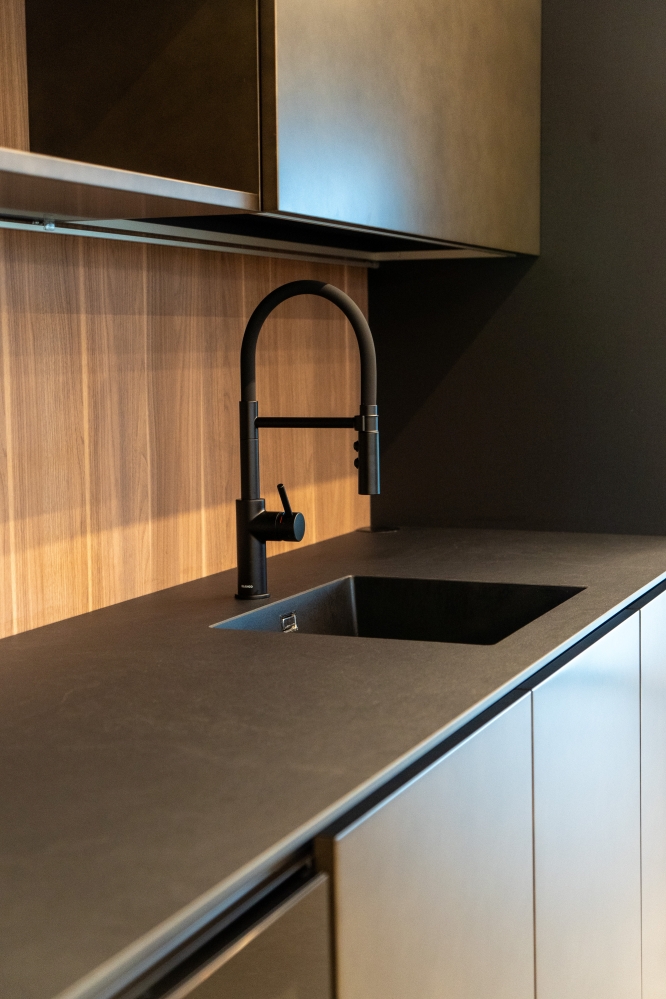 Uno degli elementi indubbiamente più affascinanti di questo progetto è la cucina a scomparsa con ante rientranti semiautomatiche, che rivela un’ampia postazione aggiuntiva dalle mille risorse.