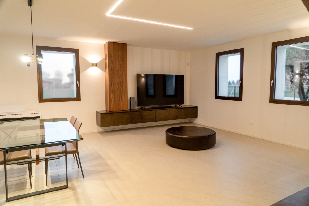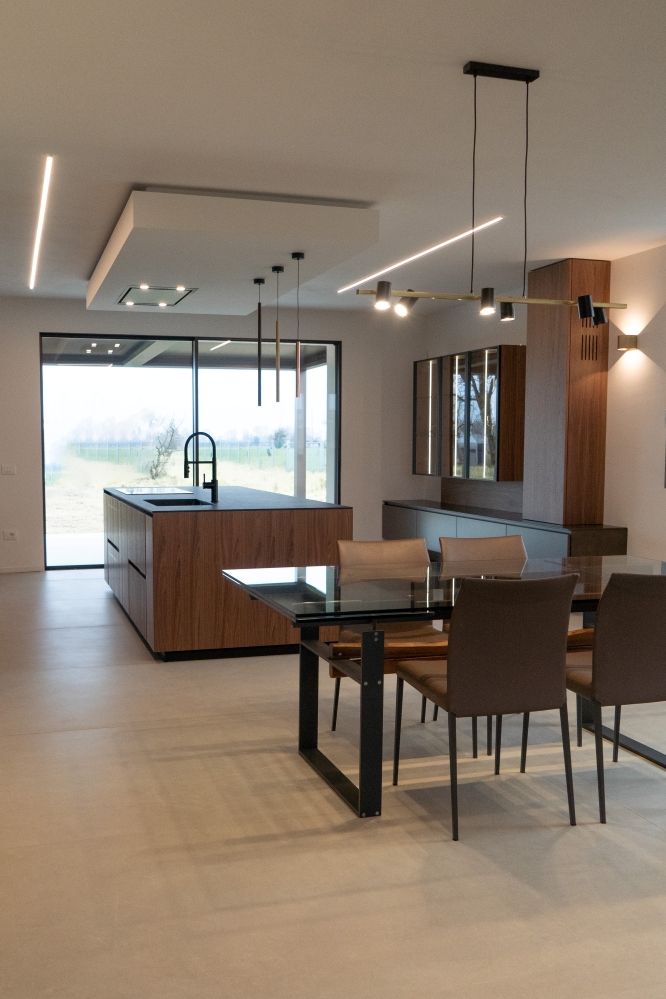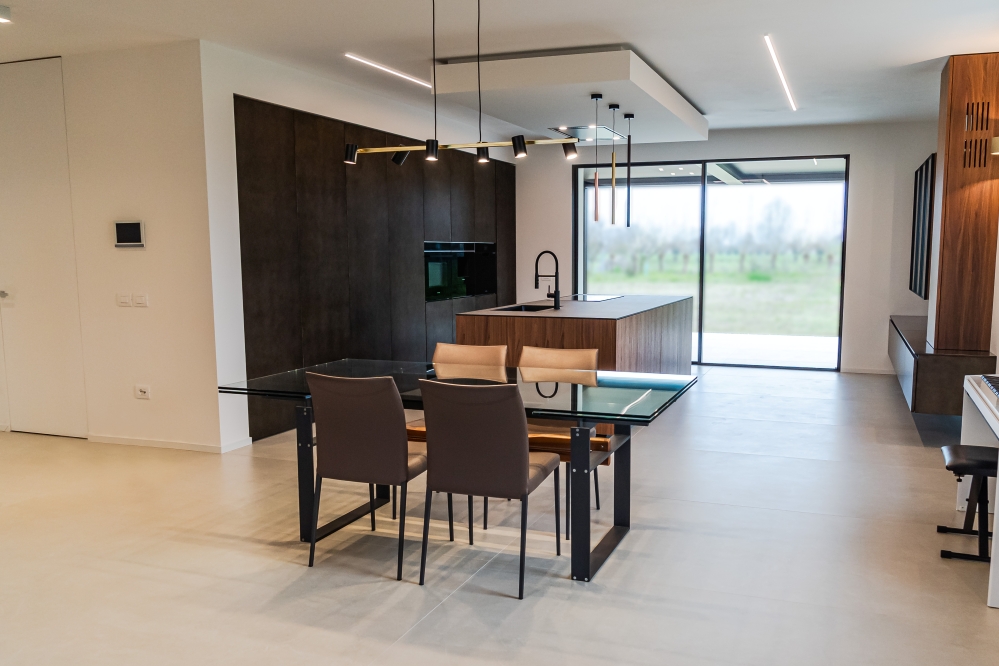 L’open space super luminoso ospita, oltre alla cucina, un’ampia zona pranzo e una zona soggiorno coordinato nelle stesse finiture noce canaletto, in continuità estetica con la cucina.