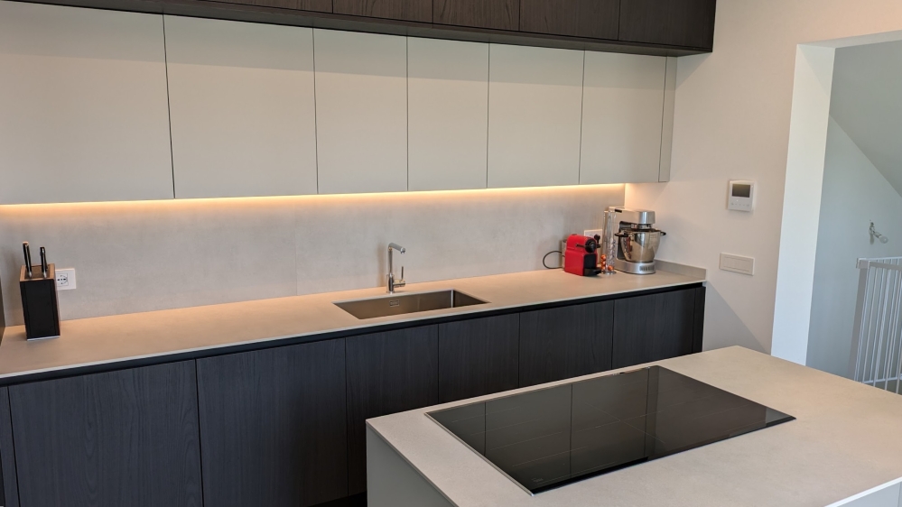 La parete parallela all’isola centrale è composta da una doppia fila di pensili: la prima, color rovere come le colonne, arriva a filo con il soffitto ed ha una profondità maggiorata. La seconda fila di pensili, color fango, è invece ribassata e a profondità ridotta. Sotto di lei, la pratica luce sottopensile. Le basi sono composte da spazi contenitivi ed ospitano la lavastoviglie.