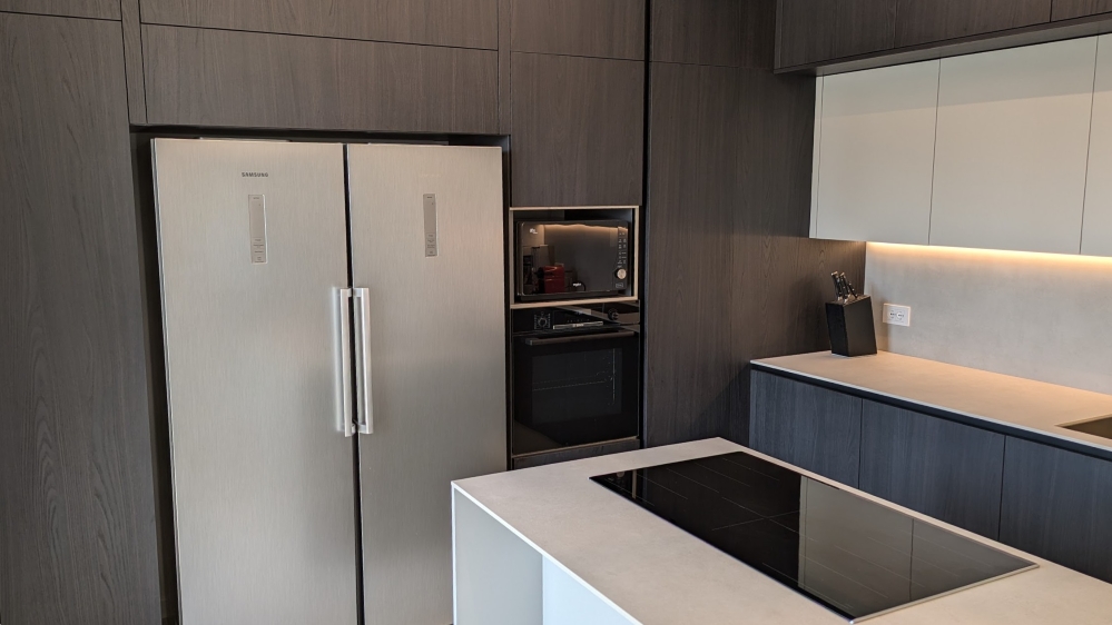 La grande parete colonne in rovere è costituita da diversi spazi contenitivi, dalle ampie colonne alla struttura a ponte che circonda il frigorifero. É qui che troviamo inoltre lo spazio per forno e microonde incassati.
