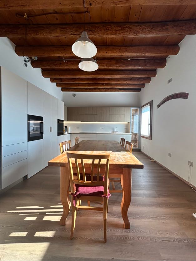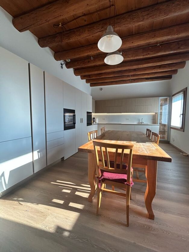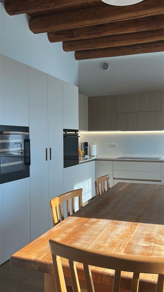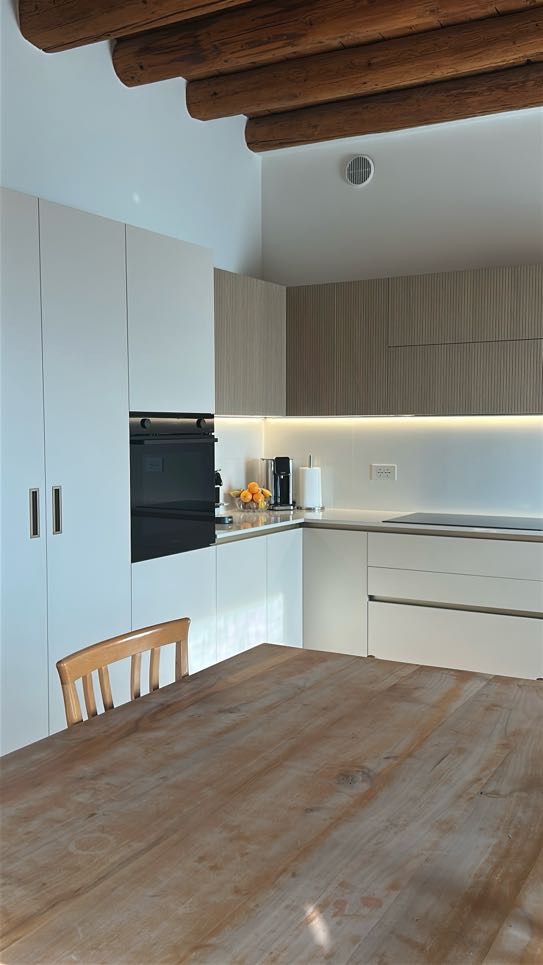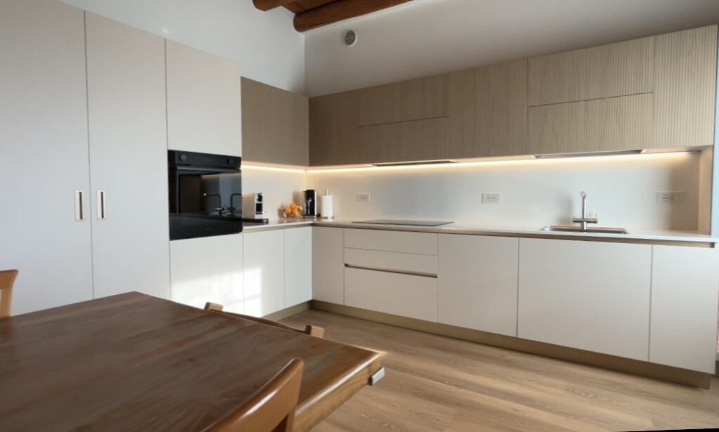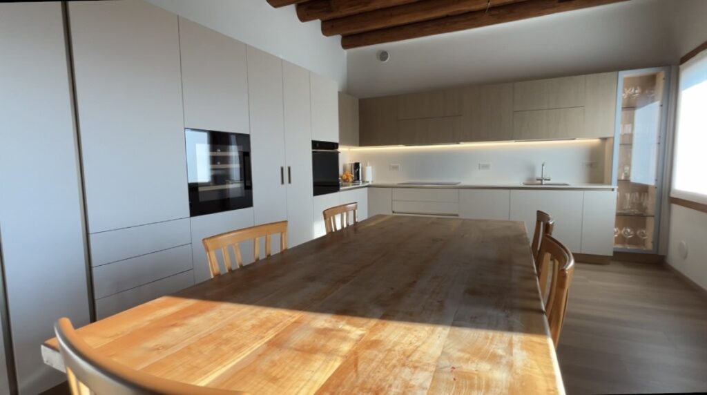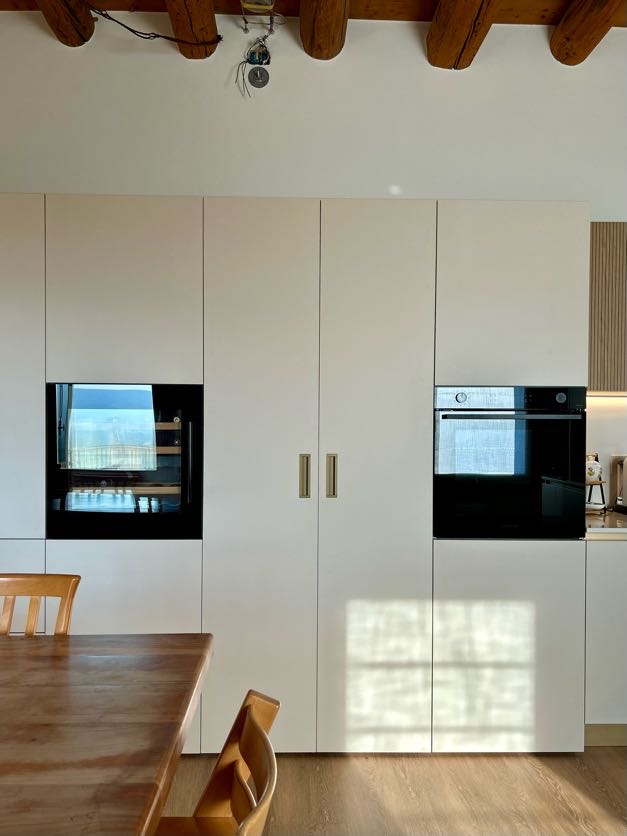 La soluzione è servita: le ante della cucina nascondono in realtà una porta segreta che permette l’accesso diretto al vano sottoscala. Una soluzione architettonica intelligente che trasforma un potenziale ingombro in un elemento invisibile.