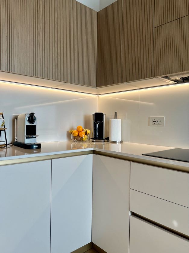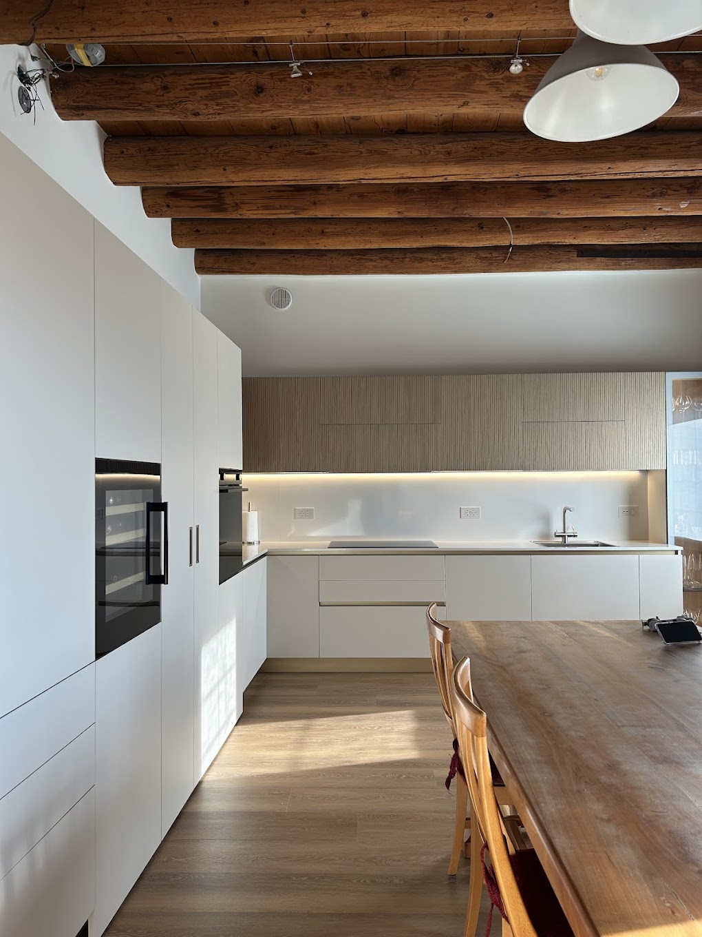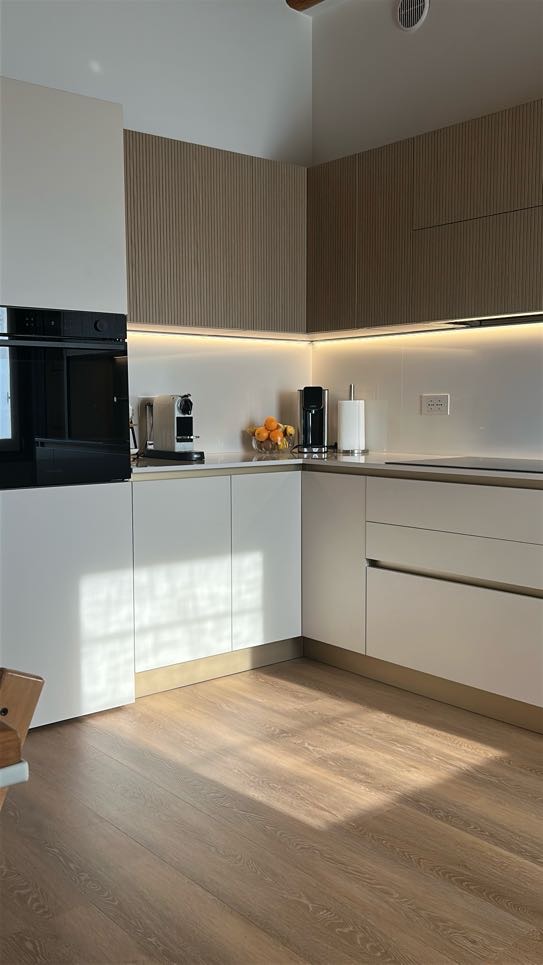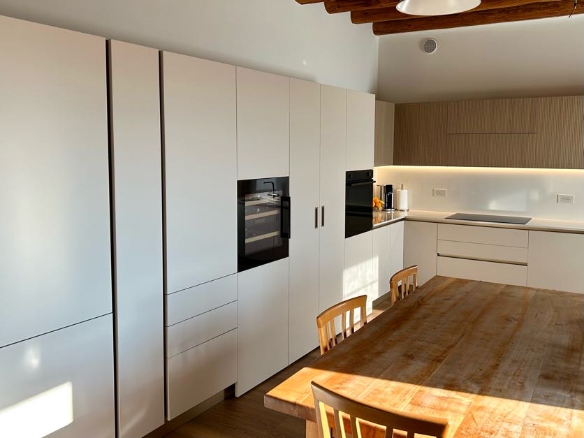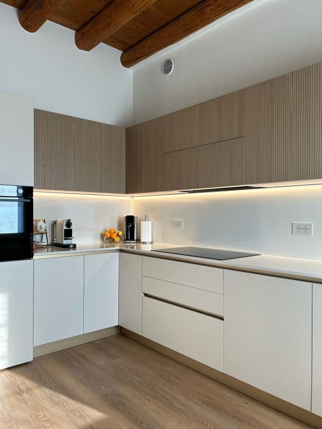 Il primo dettaglio che cattura lo sguardo in questa cucina moderna angolare è senza dubbio la texture delle ante. Per assecondare le richieste dei clienti di avere in casa un elemento che desse una sensazione super naturale abbiamo scelto il legno vero cannettato, che dona un effetto di tridimensionalità perfetto per alternarsi al minimalismo del total white.