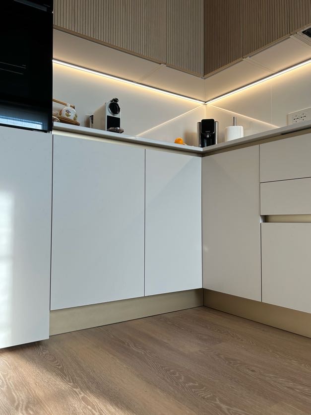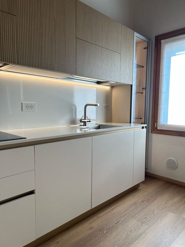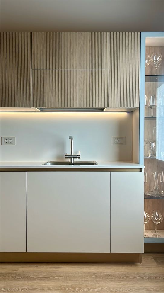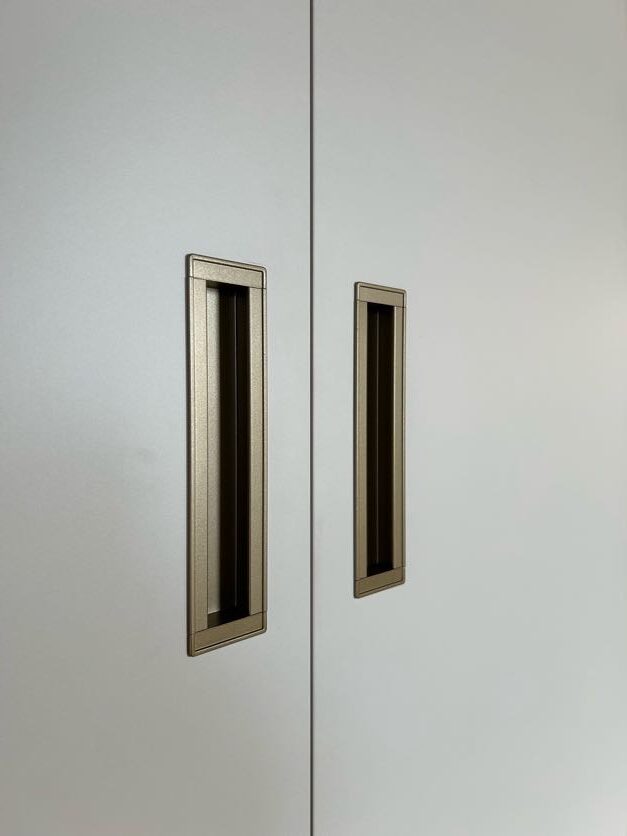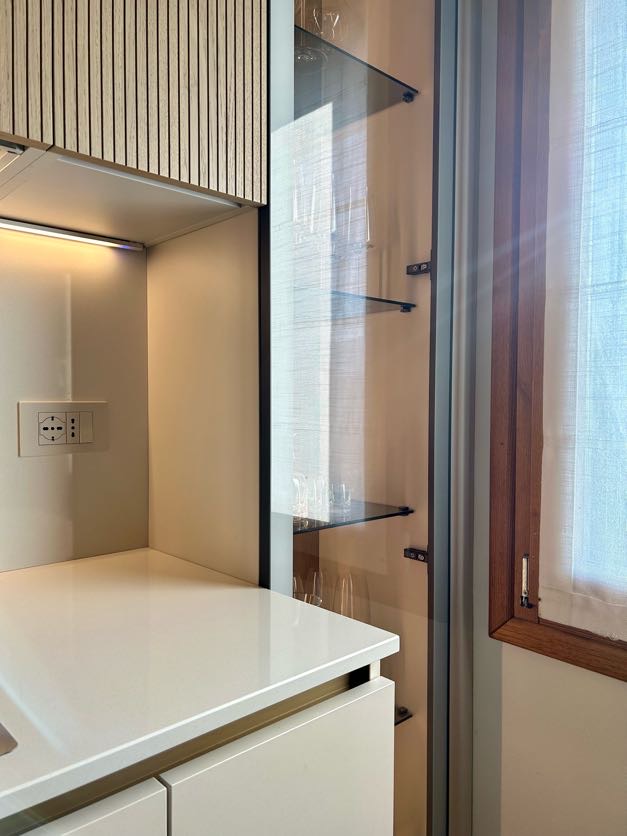 A questa alternanza di cromie siaggiunge una terza tonalità: gola, zoccolo e maniglie infatti sono in finitura Champagne, un colore che dona alla realizzazione un dettaglio glamour
