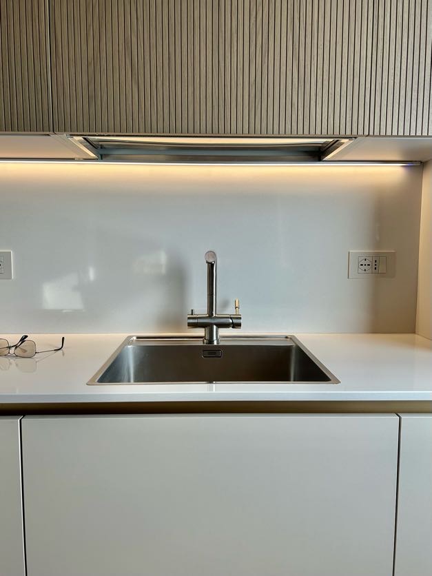Il lavello semifilo ed il miscelatore a tre vie (una delle manopole è dedicata all’acqua filtrata da bere) sono invece di color acciaio.